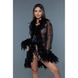 This ultra luxurious robe features a soft mesh bodice, a lush feather trim, a full length sleeve with matching feather trim, and a flirty short cut fit. (Thong not included.)