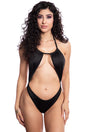 Show off your curves in this sexy open bodice dance romper. Designed with halter straps, a comfortable lycra fabric, a cut-out open bodice, a low open back, a high cut leg, and a V-cut thong back. One Size Fits Most.