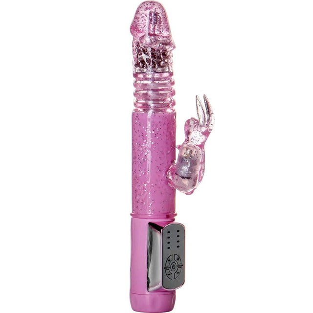 Pretty, petite and ultra-pleasurable, CalExotic's Petite Thrusting Jack Rabbit provides an ideal beginning to erotic toy exploration, or is perfect if you just don't want a huge toy*. Petite Thrusting Jack Rabbit's classic shaft and bunny-shaped stimulator target nerve-rich inner vaginal walls and clitoris as the pleasure bead-filled shaft offers 10 loving speeds of vibration, pulsation and escalation, 4 patterns of synchronous rotating and thrusting action.