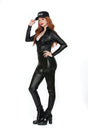 Be a dangerous baddie in this SWAT Hottie costume featuring a matte vinyl jumpsuit with long sleeves, a V-neckline, a front zipper closure, a matching harness with shoulder straps, double front straps, clip closures, garter straps and wraparound leg garters, and a "SWAT" hat.