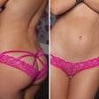 These Cageback Crotchless Panties have lurex threads sewn in to give them their sexy, metallic shimmer. These teasingly bare strappy cage back panties look irresistible and match perfectly with your favorite camisole, chemise or bra or thigh-highs set. The open crotch allows for flirty glimpses and naughty play and the open back with cage strap detail and satin bow make them irresistibly sexy.